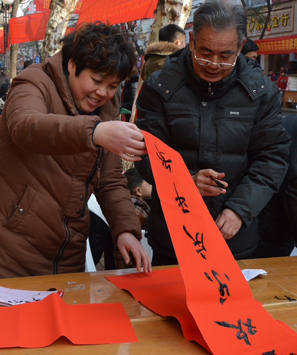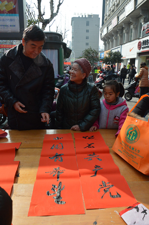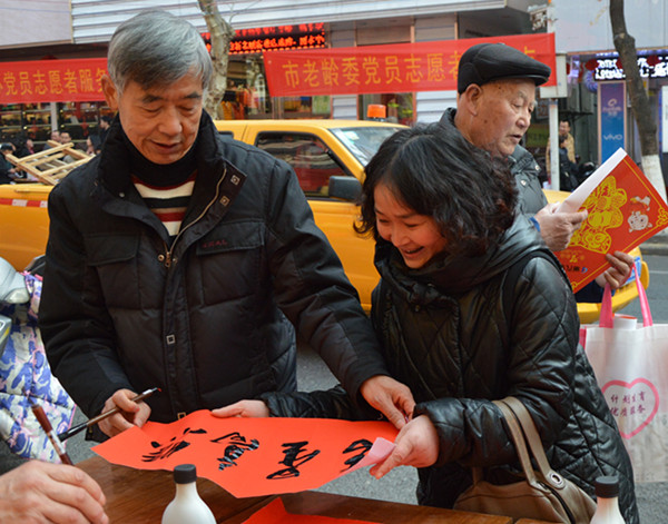幾張小桌子拼成的簡易書案更是黨員一條街上靚麗的風景。三位老同志一落筆,書案旁邊一下子就圍滿了人,大家一邊排隊等候著“墨寶”,一邊點贊著三位老師的書法。葉女士高興地說:“手寫的春聯(lián)不僅更有年味,而且還是在弘揚中國的書法藝術。中國傳統(tǒng)的年俗文化,現(xiàn)在已經(jīng)越來越難得了?!币粚﹄p胞胎寶寶的父母恰巧推著嬰兒車從服務點前經(jīng)過,趕緊請老師寫下“開心寶貝”四個字,還說是給孩子倆最珍貴的新年禮物。