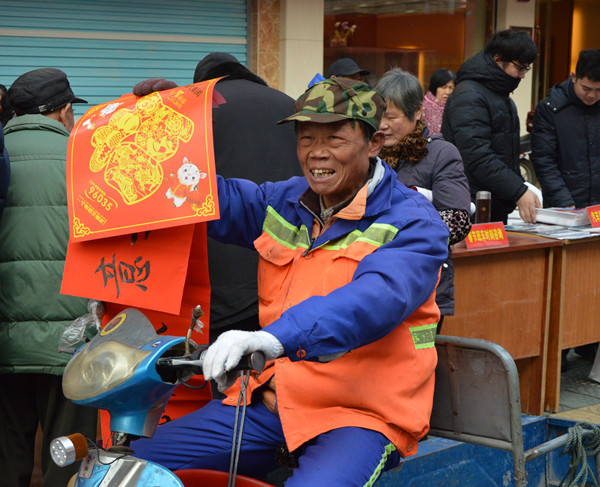 環(huán)衛(wèi)工人接過麗汽集團黨員送上的福字和春聯(lián)臉上樂開了花