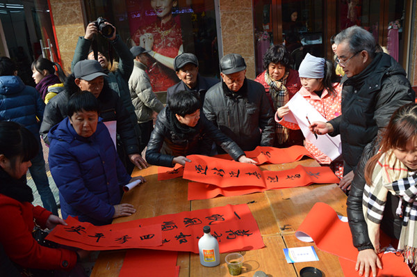 雖然時節(jié)已過立春,但農(nóng)歷臘月十九(2月7日)的早上還是寒意逼人,麗汽集團的黨員們卻一早就來到中山街路段,面向廣大群眾展開了春節(jié)班車時刻咨詢、汽車銷售維修服務和送春聯(lián)、送福字三項服務。退休老黨員蘭延生、陳根松、王法根三人更是現(xiàn)場潑墨揮毫,冒著嚴寒為現(xiàn)場的群眾書寫春聯(lián),送去新春祝福。短短半天時間里,黨員們共發(fā)放春運班車時刻表、汽車銷售維修資料500份,解答咨詢76人次,贈送福字1800張,為群眾現(xiàn)場書寫春聯(lián)450幅,惠及群眾1500人次。